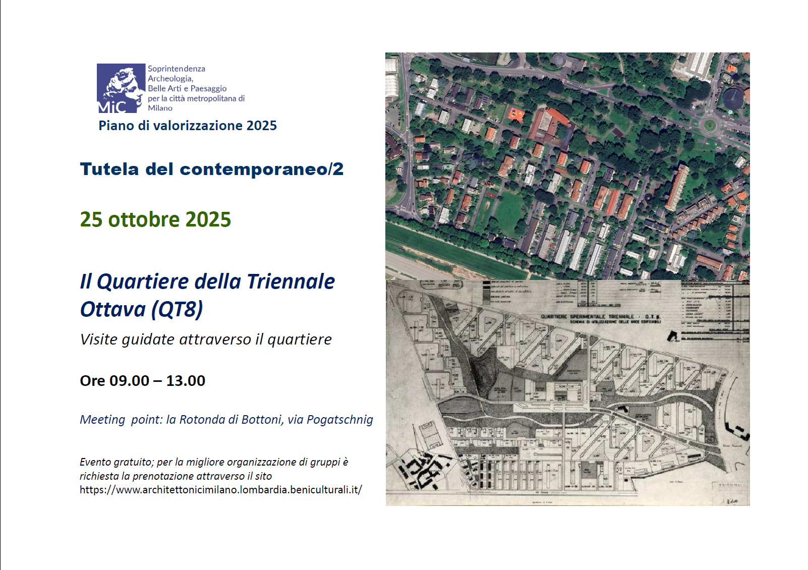 Il QT8 (acronimo per Quartiere Triennale 8a) è nato nel secondo dopoguerra come quartiere “sperimentale”: moderno e funzionale, il QT8 doveva soddisfare ogni necessità dei suoi abitanti, presentando non solo abitazioni, ma anche servizi, scuole, negozi e ampie aree verdi. Durante la visita si illustreranno gli episodi urbanistici, architettonici e artistici più significativi del quartiere, in una visione globale che porterà alla scoperta di un luogo davvero unico nel panorama italiano ed europeo.