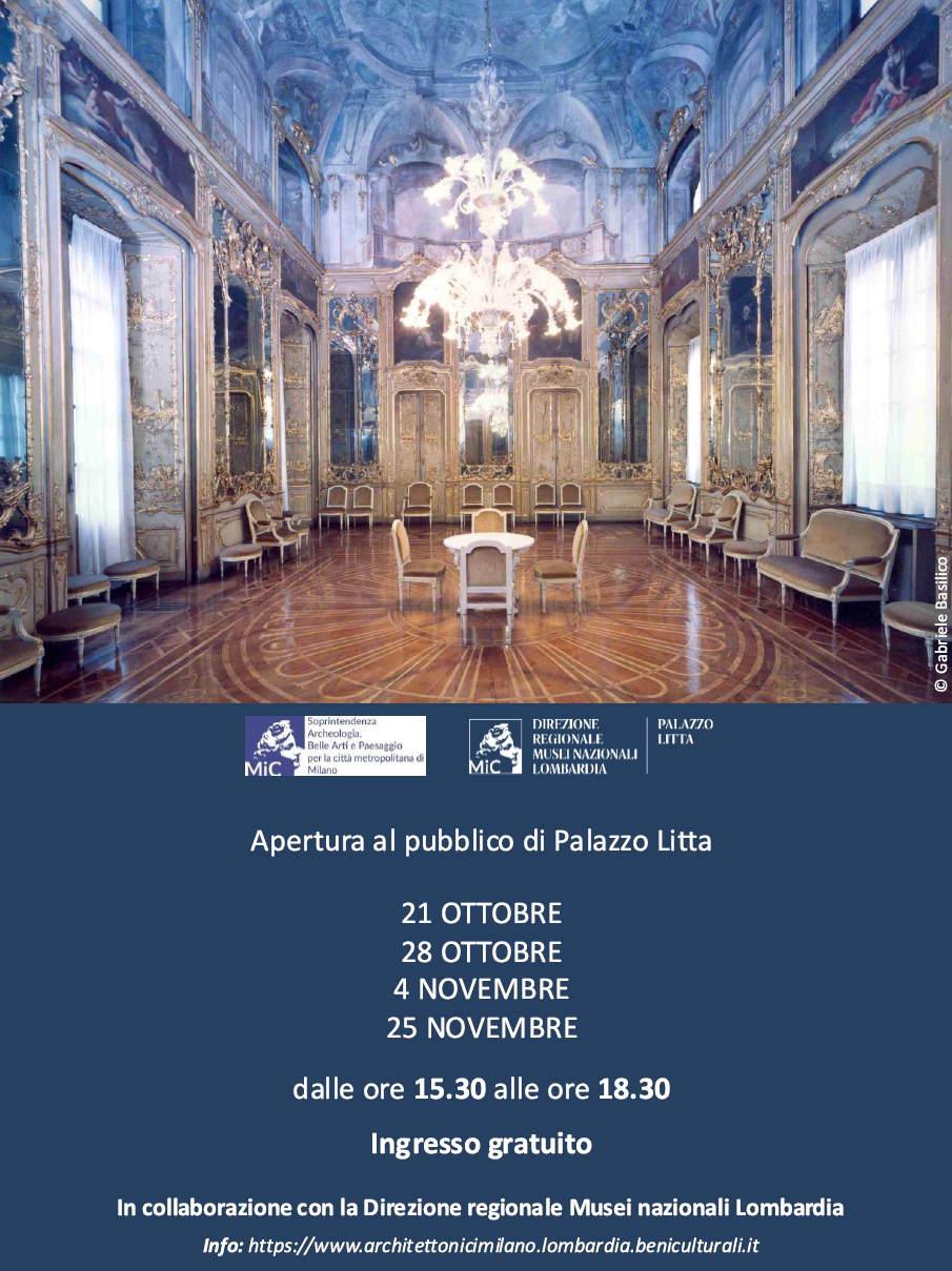 Sono inoltre previste, da ottobre a novembre, quattro aperture al pubblico di Palazzo Litta e, in particolare, delle sale del piano nobile, in collaborazione con la Direzione regionale Musei nazionali della Lombardia e la direzione di Palazzo Litta.