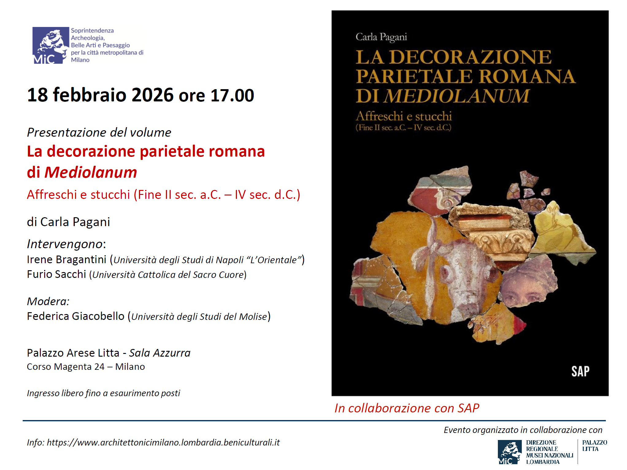 Mercoledì 18 febbraio alle ore 17.00 si terrà nella Sala Azzurra di Palazzo Litta la presentazione del volume La decorazione parietale romana di Mediolanum. Affreschi e stucchi (Fine II sec. a.C. – IV sec. d.C.) di Carla Pagani.